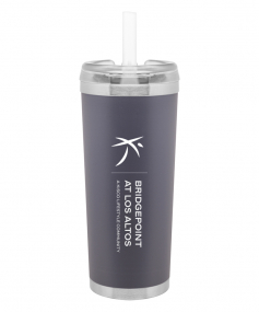 24 oz double wall 18/8 stainless steel thermal tumbler with copper vacuum insulation, stainless steel rim and base, threaded Eastman Tritan lid, snap closure, straw opening, and flexible wide silicone straw.