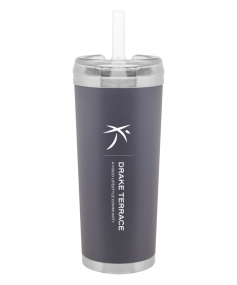 24 oz double wall 18/8 stainless steel thermal tumbler with copper vacuum insulation, stainless steel rim and base, threaded Eastman Tritan lid, snap closure, straw opening, and flexible wide silicone straw.