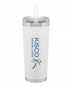 24 oz double wall 18/8 stainless steel thermal tumbler with copper vacuum insulation, stainless steel rim and base, threaded Eastman Tritan lid, snap closure, straw opening, and flexible wide silicone straw.