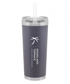 24 oz double wall 18/8 stainless steel thermal tumbler with copper vacuum insulation, stainless steel rim and base, threaded Eastman Tritan lid, snap closure, straw opening, and flexible wide silicone straw.
