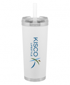 24 oz double wall 18/8 stainless steel thermal tumbler with copper vacuum insulation, stainless steel rim and base, threaded Eastman Tritan lid, snap closure, straw opening, and flexible wide silicone straw.