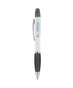 Twist-action ballpoint pen. Curvaceous glossy white barrel with translucent color rubber grip and matching highlighter cap. Shiny silver accents. Black pen comes with yellow highlighter ink. 5 11/16" L x 17/32" Diameter