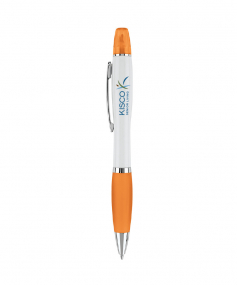 Twist-action ballpoint pen. Curvaceous glossy white barrel with translucent color rubber grip and matching highlighter cap. Shiny silver accents. Black pen comes with yellow highlighter ink. 5 11/16" L x 17/32" Diameter