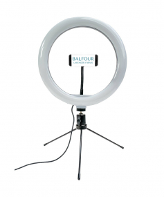 Lights, camera, action! The McLighty is a ring light and cell phone holder in one, a must-have for any office space. You'll be fully illuminated by this 10 inch LED light on all your video calls and with a warm, cool, or neutral light option you'll look your best no matter the lighting situation. It's compact and portable so if you're taking virtual meetings on the go, this light is ready to come along for the ride. Light is 10.5" tall when not mounted to the stand & 16.5" tall when mounted. DTS, 1.0625 x 2.25, On the cell phone holder.