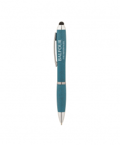 The Olivia Twist-Action Plastic Ballpoint Pen is made from a 50/50 blend of renewable wheat straw, which is the stalk left over after the harvest of wheat grains and ABS plastic. It has chrome trims, a metal clip and a capacitive stylus for touch screen devices. This pen makes a great eco-conscious gift and writes in black ink.