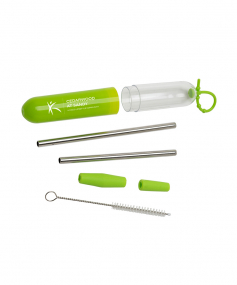 The Paloma 5-Piece stainless steel straw set comes in an oval cylinder case with a transparent cap and a colored bottom. The lid has a beaded silicone locking strap to attach to your backpack, purse or bag making it convenient to travel with. This set includes 2 stainless steel straw parts that can be used individually or linked together with a silicone connector for use in taller cups, a cleaning brush and a silicone tip to drink from. The maximum straw length is 10 1/4" with the connector and . Complies with Prop 65. 1" W x 6" H x 1" D