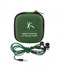 Molded textured case with zipper closure. Includes matching Braided Ear buds. Complies with Prop 65. 3.25" L x 3.25" H x 1.25" W