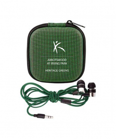 Molded textured case with zipper closure. Includes matching Braided Ear buds. Complies with Prop 65. 3.25" L x 3.25" H x 1.25" W