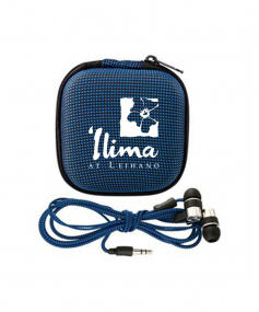 Molded textured case with zipper closure. Includes matching Braided Ear buds. Complies with Prop 65. 3.25" L x 3.25" H x 1.25" W