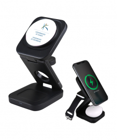 The Trifecta is your all-in-one charging solution, elegantly designed to power up your essential devices simultaneously. This versatile charging stand features a powerful 15W magnetic wireless phone charger, dedicated 5W Apple Watch charging station, and a 2.5W wireless earbuds charging pad. Perfect for hybrid work environments, the Trifecta's ingenious folding design transforms from a full charging station to a compact travel companion.