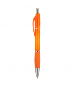 The Wave plunge-action ballpoint pen has a translucent hourglass barrel design and black ink. It has a matching color clip and rubber grip and chrome accents.