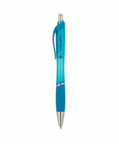 The Wave plunge-action ballpoint pen has a translucent hourglass barrel design and black ink. It has a matching color clip and rubber grip and chrome accents.